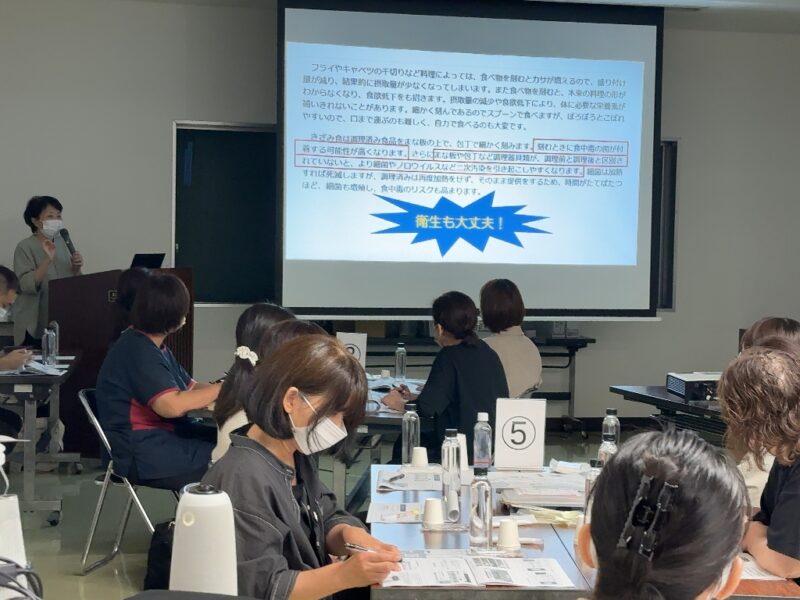 今回市民病院から肱岡氏,丸田氏を講師として招き,高齢者等の食形態として選択されることの多いきざみ食に着目し,体験を通してその有用性,問題点について具体的に学び,安全な食支援の実践に活かすことを目指した研修会を開催した。肱岡氏からきざみ食や嚥下調整食の特徴,きざみ食による誤嚥の危険性と安全に食べる方法について講義があり,グループワークでは丸田氏から試食の意義や咀嚼方法の解説とグループごとに下記の体験学習を実施した。