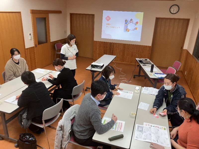 はじめにゲームの趣旨と方法を説明した後,参加者6名,アドバイザー1名,当センター職員1名の計8名が2グループに分かれて実施した。